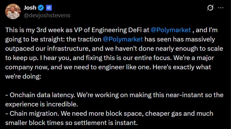 Учора з’явилися два цікавих твіти. У першому повідомляється що Polymarket додали авторизацію через Telegram. А в другому віцепрезидент з розробки DeFi в Polymarket каже, що Polygon їх уже не влаштовує (повільний, дорогий, мало блокспейсу), тому запланована міграція на інший блокчейн. Співпадіння? Скоро дізнаємось.